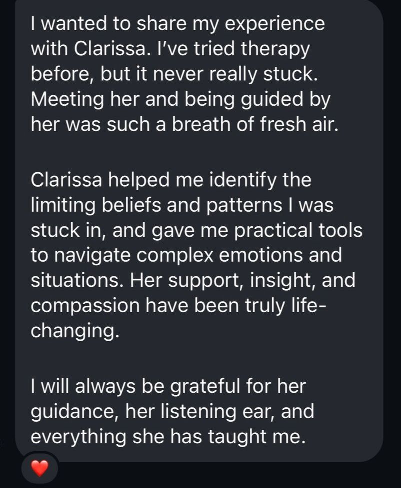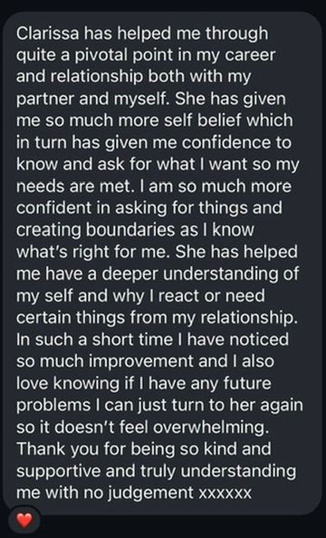 Each week, Clarissa shares voice notes, life-coaching tools, and nervous-system regulation practices you can save to your phone, supporting you in the moments your chest tightens, your mind spirals, or silence feels unbearable. These practices help you return to your body, build self-trust, and stop reaching outside yourself for reassurance.